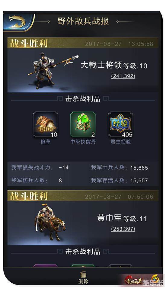 出征一段时间后,将士便凯旋而归了,我们浏览战报便可看出,一方面能看出我们收获的战利品,这个毋庸置疑;另一方面,我们需要了解我方的损失情况,在这一战中,我方没有产生死兵,不过受伤了8个士兵,损失比较小,正是因为我们配置的兵种合理,否则受伤量会非常的多。
