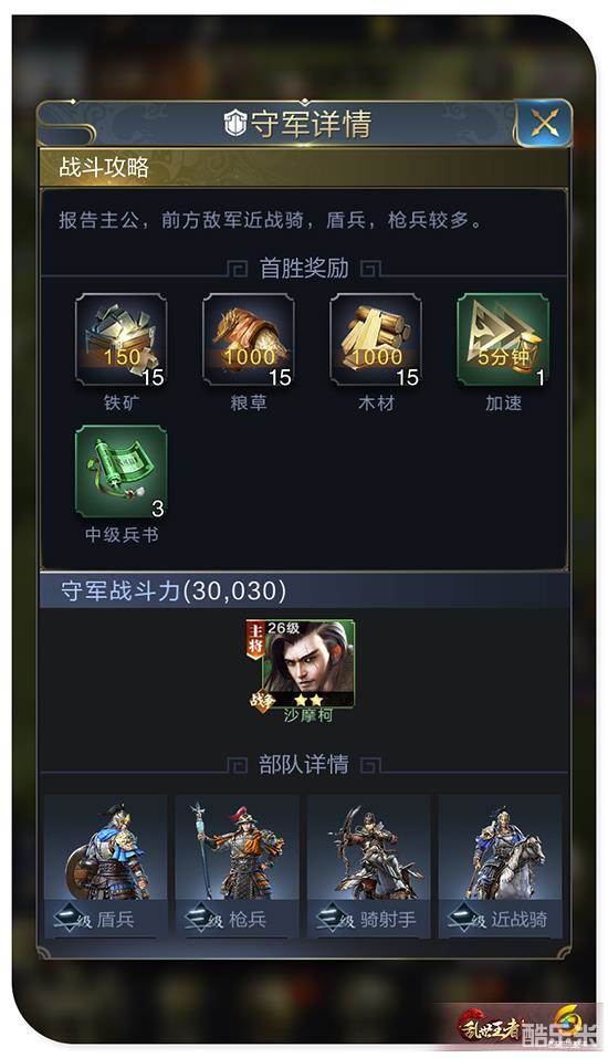 观察完之后,我们发现敌方的骑兵和步兵比较多,初步判定防守力量较强,但是缺少攻击力量,一旦破掉前方战线,后方的骑射手便会失去盾牌,不堪一击。再来看数量,总共就是19680点兵力。根据兵种数量和兵种我们就可以部署军队了。