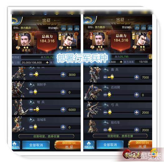 先说一下兵种的选择,因为对方防守力量强,所以我方必须部署比他们还多的防守部队进行压制,就需要盾兵的支援。而对面的骑兵就由我方的枪兵来摆平,毕竟枪兵克制骑兵,占据兵种的优势。既然对面有枪兵,我方就不选择派遣骑兵了,以免造成损失。最后,就是选择输出的弓兵营加上投石车了。