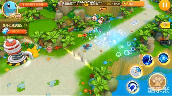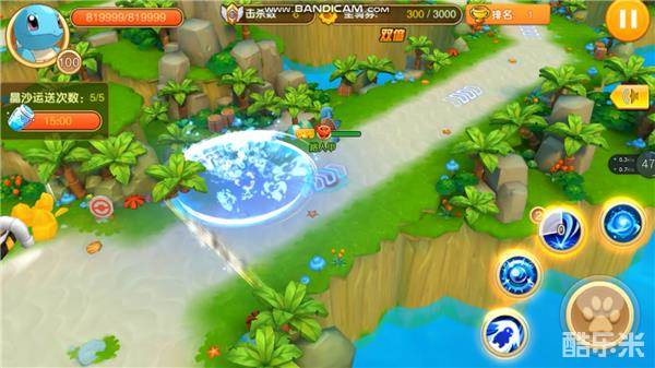 杰尼龟召唤河流的力量喷出水球,在敌人之中炸开造成巨大的伤害,并附带吸附效果。