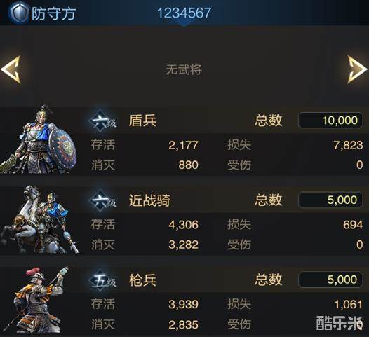 进攻方为7种部队的组合,其中防御部队1种,为盾兵,占比40%,其他6种输出部队各占比10%