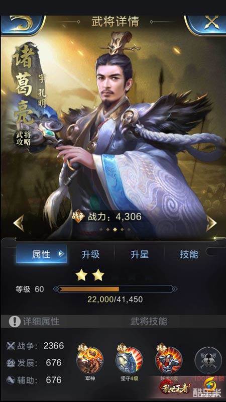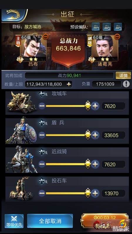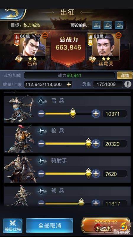其次,除了兵种部署的合理外我方的武将战斗力也较高,吕布和诸葛亮作为橙色的武将,给予了我方军队强力的属性加成。
