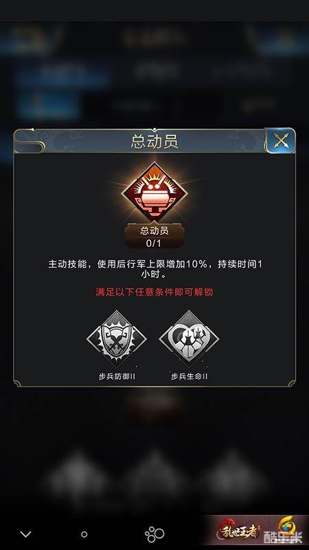 主公战争技能中的第二个主动技能大动员,主要用于后期的高级战争,可以给所有出战军队提高10%的数量上限,持续时间高达1个小时,在此期间可以进行高强度的讨伐战争。