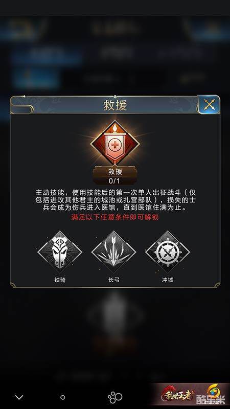 最后一个战争系主动技能堪称禁术:救援。只有在大后期才能学习,但是效果逆天可谓是起死回生。可以使最后一次出战的部队死亡兵力变成伤病进入医馆,直到医馆达到上限。