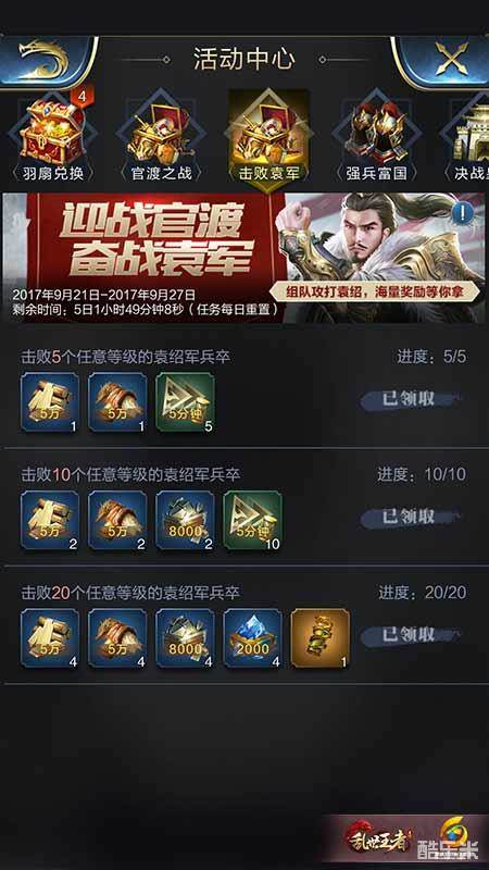 击败袁军主要有三个任务,只要击败20个任意等级的袁绍军便可以领取三个任务的福利,包括大量丰富的资源、加速道具和一个高级招募!重点是逐鹿中原这个活动!奖励更加丰厚,只需要击败野怪50次即可获得全部奖励,经验奖励从5000到2W不等,总共将会获得11.5w经验,3个高级招募和10个羽扇等等奖励,羽扇可以在羽扇兑换中换取大量资源和武将技能。