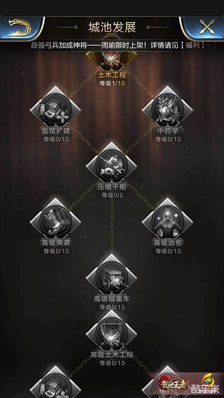 在研究科技的这段期间玩家会得到足够的医馆治疗,但是由于军队的战力没有得到提升会导致刷野、征战的效率大打折扣,造成不必要的伤病损失。玩家这时可以利用升级所带来的技能点对军队士兵的攻击力进行加成。比如刷野玩家主要攻击力在骑兵我们便可以发展骑兵攻击天赋至2点;剩下的2点玩家可以发展步兵防御天赋强大前排,为后排争取更多的输出时间、增大胜利的概率。