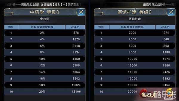 玩家在中期时医馆如果已经升级至15级左右那么这个医馆就已经有了7500的容量。医馆扩建至5级后将提高至10000相当于一个20级的医馆不仅节约了资源也为后期做了充分的准备。这样玩家便可以在中后期重点研究兵法科技提高战力。中药学将为伤兵的恢复速度加成10%点,玩家将在最短的时间内重整军队进行下一次的征战或攻击高级野外敌兵获得更多的物资并促进战力的提升。