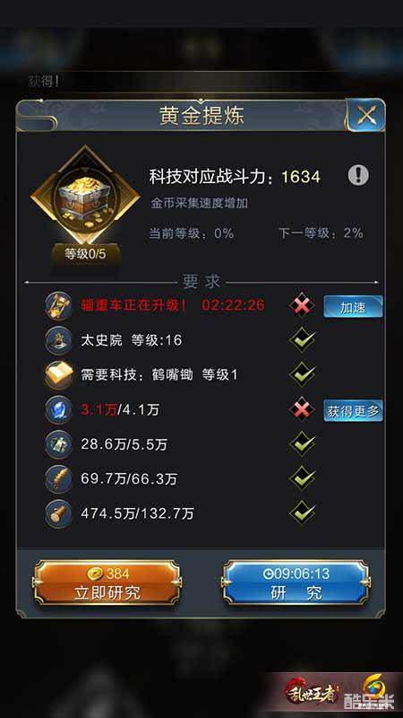 其二,再来看所耗费的资源量,前期研究一个黄金提炼就需要消耗132.7万木材,然而在联盟采集矿内采集一次仅可以弄回150万点木材;然而,训练500个五级枪兵才需要耗费2.7万点木材。相比于研究黄金提炼,训练部队不但消耗量少,而且可以提升更高的战斗力。