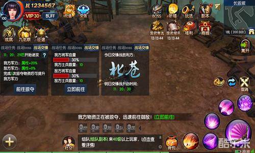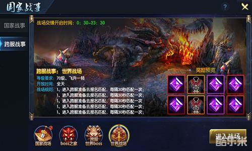 世界战场对于70级以上的玩家开放,为阵营对抗地图,总共分为三大种玩法:第一是战场任务,玩家在世界战场中击杀敌国士兵或者敌国将军、摧毁敌国军旗或者敌国粮车、掠夺敌国物资,均可以获得战场积分。玩家在战场上既要努力进攻敌方阵营,也要守卫己方阵营防止敌方偷袭,战略和勇气的双重考验,战意一触即发!