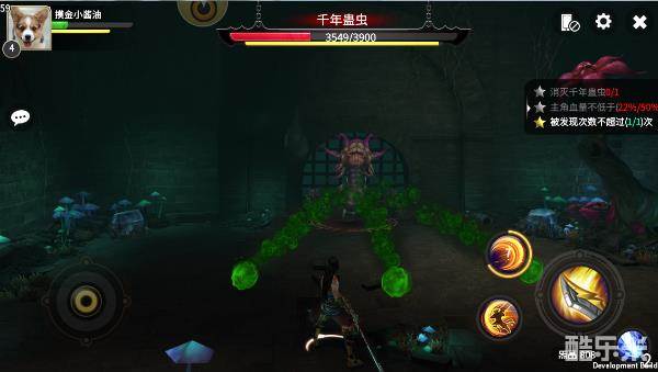 最终BOSS战——千年蛊虫。蛊虫的攻击方式主要有两种:往前喷射三道毒液球和往上喷射毒液后跟随下落。对于往前喷射的毒液球比较好躲,摸金直接贴到BOSS面前即可完全躲开,搬山也可以选择站在两边输出,不用费心思去躲毒液球。