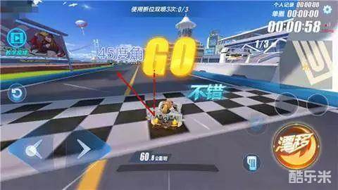 第一步,首先点击小喷键完成超级起步,起步的同时按下左(右)向键,漂移可动范围约为15度(车头与直道的角度约为15度)。