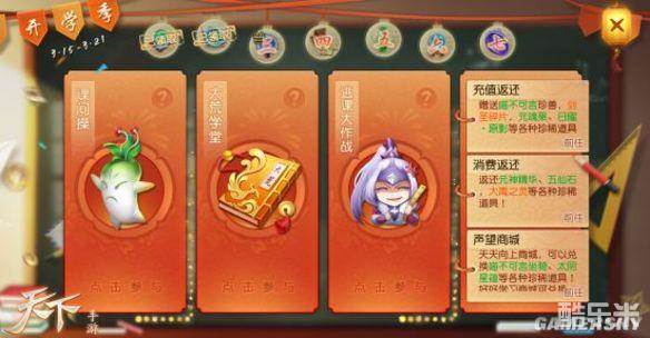 3月到,开学忙,莘莘学子在一个寒假的放松后也陆续踏上了返校的旅程,《天下》手游开学季活动正在火热进行中,大荒少侠元气迎接,作业、逃课、课间操、学富五车,成为了大荒的“头条”,数种益智有趣的活动吸引了大荒少侠踊跃参加,多重丰厚奖学礼,为你新学期助力升级!更有新时装,新坐骑,新表情让你新学期华丽变身。少侠,赶快叫上自己的朋友,来《天下》手游续写你的大荒开学元气吧!