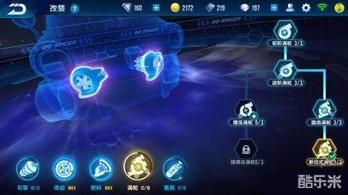 大Q吧有着超高的漂移能力喷射能力和集氮能力,只有速度方面显得平平无奇,改进赛车就要以增加车速为核心来改装。所以这里先改引擎,后面的在慢慢改