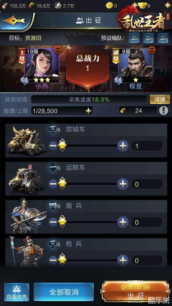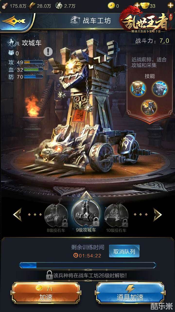 战车工坊的攻城车1级的时候名字是运粮车!各位君主别认错,其实运粮车就是攻城车,作用是相同的。游戏中君主要获得重要的资源少不了要出门采集!而《乱世王者》中所有士兵单位都有各自的负重极限,比如一个近战骑兵的负重是6资源,也就是说假如一个近战骑兵采集资源,只能带回6单位的资源,而这个时候攻城车就可以发挥其在采集方面中流砥柱的作用!