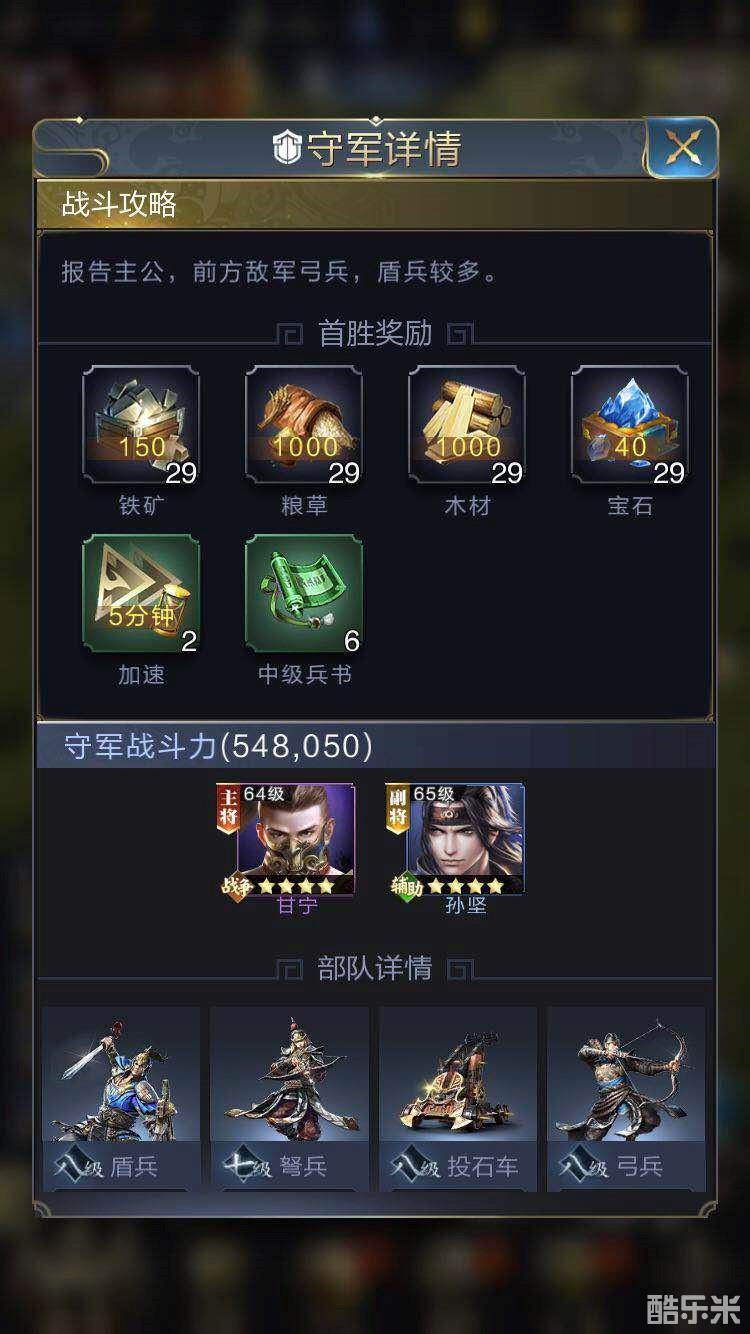 攻打势力锯点这对君主战力整体兵力、战争武将都有较强的要求,攻打势力锯点可通过查看守军详情查看驻守收益、守军战斗力、部队兵种几大数据。