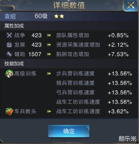 张角/孙尚香拥有紫色辅助将带有的优异辅助值,升级到60级辅助加成就达到8.76% 。在点上征兵技能7级后,增加了77名训练上限。