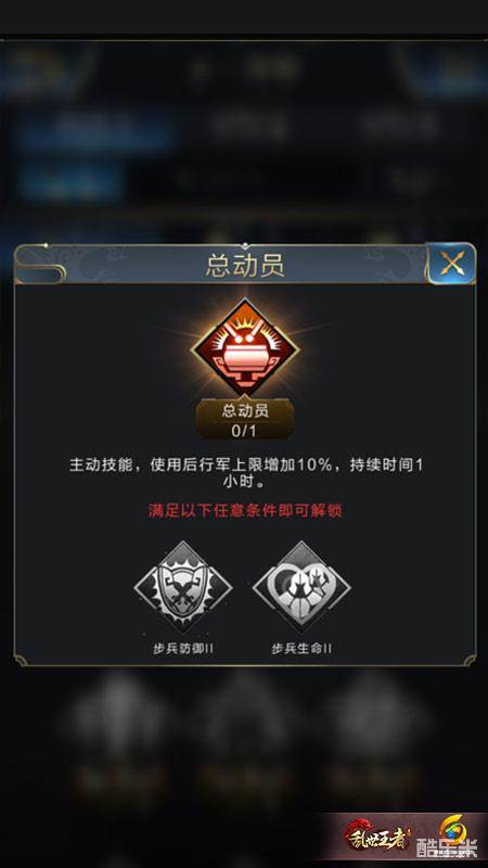 首先,作为主战派,我们在前期发展的时候就是以战争为方向的。我们可以在君主技能组下的战斗技能中,学习“总动员”技能,使用后行军上限增加10%,持续时间1小时。