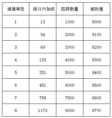 这里只列举出前8级的城墙城防值,我们可以看到城墙每升一级,相应的城防值就会增加,对于我们而言,城防值越高固然是越好的。