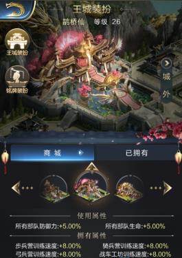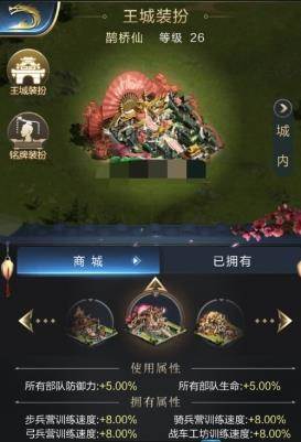 属性:所有部队防御力和生命+5%,所有兵营训练速度+8%,时效1天、7天、30天、永久。