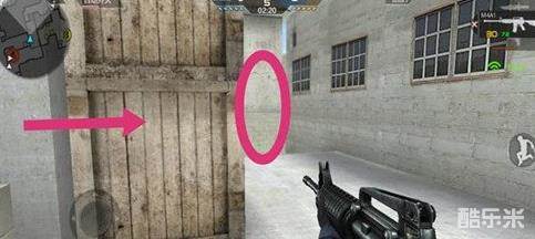 这张地图的B大道拐弯非常多不适合狙击步枪发挥,所以只能依靠步枪进行防守。如上图所示,保卫者来到这处位置的速度快于对方,建议这个位置由两名队员防守(基本不占地形的优势)。在上图的位置提前瞄准,敌人露头后点射集火攻击。有个小技巧是上图箭头所指处有一个木制小门,这个门是可以被子弹打穿的,适当的点几发子弹有意想不到的效果。