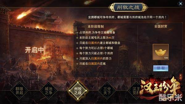 在此阶段中,主城的屯兵上限将扩张为40万,方便城主们组织精兵良将,逐鹿中原!同时,每个势力可占领3个郡城,并可在本阶段末期向州府城池发起进攻,以获取王城争夺战的资格。战火持续蔓延,纷争再次升级,州牧之战一触即发,鹿死谁手拭目以待!