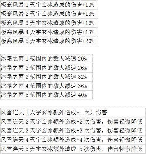 天宇玄冰:引导天降玄冰砸向范围内目标造成6次伤害,每次额外伤害