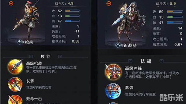 7级枪兵和8级近战骑在基础属性上相差并不大,攻、血数值上8级近战骑略占优势,不过技能上枪兵与近战骑差别比较大。