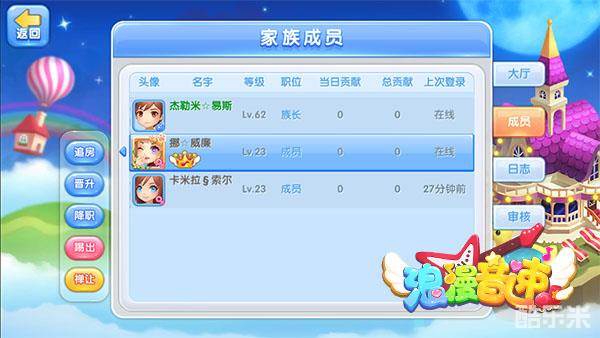 成员界面中可以看到家族各成员的详细状态,如果你是族长或有其他权限的管理员,还可以对成员进行升降职等管理操作。除了查看成员信息外,还可以查看家族的日志