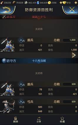 可以很明确的看出,在有了前排的支持下,守方的八级弓打出了全队85%的伤害,在弓兵爆炸伤害下,快速的结束了战斗回合,使得守方的500盾兵都没有死完,而攻方的八级盾绝大多数都葬送在了弓兵的箭矢之下。