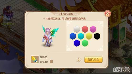 羽翼可以染色,点击羽翼栏左上方的刷子按钮进入羽翼染色界面。在染色前可以先看一看羽翼染色效果。羽翼染色为随机染色,而且需要消耗焕彩绒。在染色前一定要做好大男子主义的鬼王男弟子染出了骚粉的心理准备。