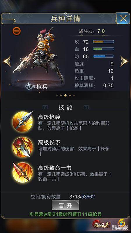 ”工欲善其事,必先利其器。“想要办好要做的事,一定要让工具先锋利起来。《论语·卫灵公》中这句话,比喻要做好一件事,准备工作是非常重要的!在乱世王者的战场上,更是如此。带兵打仗前要先把自己的武器磨砺的锋利。枪兵一直以来作为最受大众喜爱的兵种,在上战场前,玩家也需要对其进行全副武装。张飞、关羽、夏侯惇等武将提高枪兵作战能力的重要培养对象。