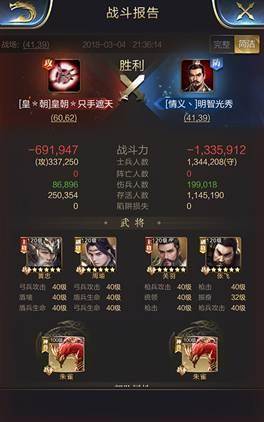 守方(败):120级关羽+120级张飞+100级朱雀,134万兵力。