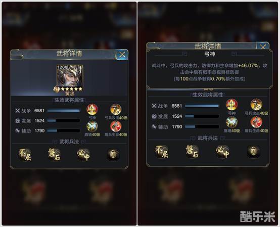 黄忠学习了弓兵攻击、盾墙、盾兵生命,且都是满级。天赋技能提供弓兵攻防血三属性46.07%的提升,并且击中目标有概率忽视目标防御,属于破防属性。
