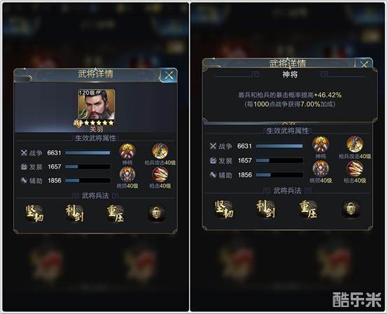 攻方的武将已经是弓兵的顶尖武将配置,防守方也丝毫不弱。关羽满级,学习了枪兵攻击、枪击,以及统领。可能是有自己独特的用意学习了统领,一般我们会选择学习枪兵生命或者枪兵防御多一些。天赋技能神将提供盾兵和枪兵暴击概率46.42%。