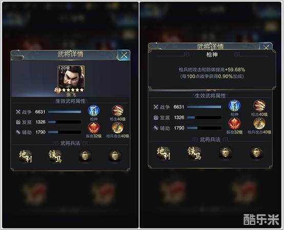 张飞学习了枪击、枪兵攻击,这两个是枪兵武将必备技能,另外还学习了新技能振奋,是全体属性加成的技能。其天赋技能枪神提供给枪兵59.68%的攻击和防御加成。