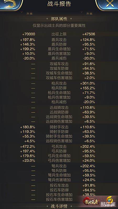 枪兵攻击提供58.35%的枪兵攻击加成,枪击提供给枪兵35.01%的概率再次攻击,统领提供17505的部队出征上线,这个属性在这则战报中几乎没用,因为是守城方。