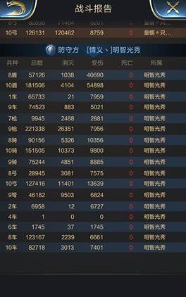 守方兵种明显过于杂乱,10级顿和8级盾战损超过9万,9级枪和10级弓战损各超1玩,其他各位置兵种都有多多少少几千的战损,打出主要伤害的还是9级枪和10骑10弓。