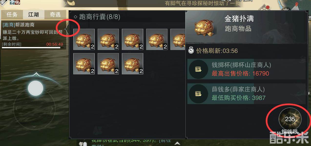 这里特别要注意一下,如果你在严州跟薛家买的东西价格都比较贵,可能导致,从薛家回到严州还不够20W,那么在你买完的时候可以用铜钱眼,看一下价格,去一个价格高的地方卖,再会帮派,不会还要一个来回浪费时间。