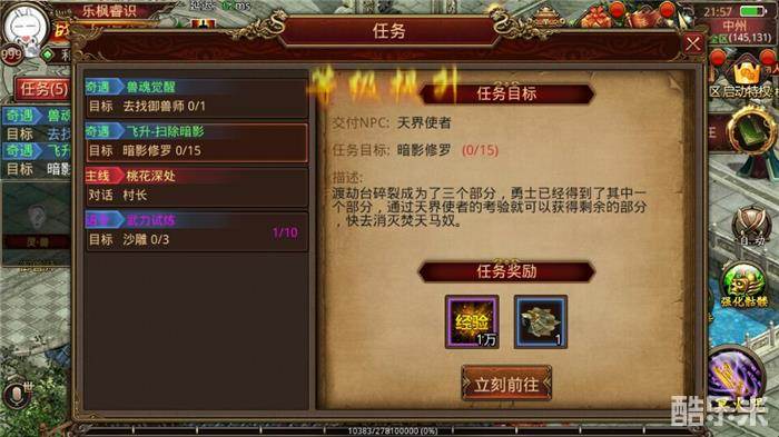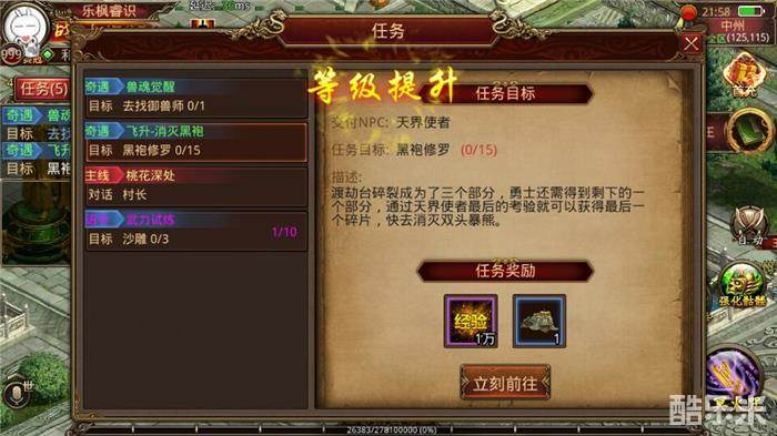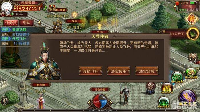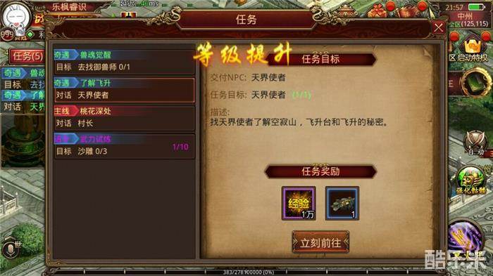 当玩家达到55级之后,就会开启飞升的前置任务。开启飞升需要获得道具“渡劫台”,而渡劫台需要三块碎片才能合成,对应的也是三个任务。第一个任务直接找天界使者即可完成,尔后两个任务需要击杀15个相应的普通怪物。前置任务相对比较简单,55级的玩家都可独自完成。