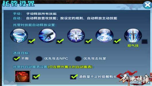在实际PK中,为了方便操作或者是提高技能的释放效率。设置为自动释放普攻技能、手动释放技能,使用“精准操作模式”预判释放仙人指路、啸风三连击。无论是宋金战场,还是门派竞技的单挑环节,都非常有用。在面对群战的时候可以调节成自动释放啸风三连击、雷动九天,手动释放仙人指路、混沌剑阵。