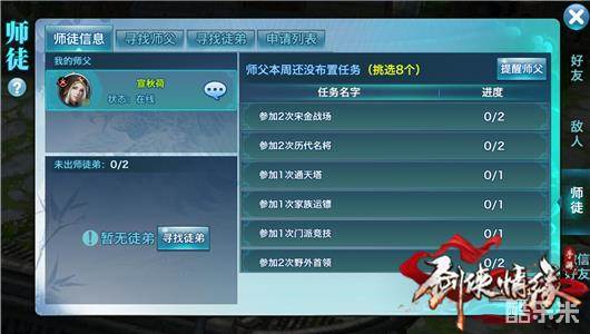 对于已出师的徒弟,少侠可以每周为其布置一次任务,任务涵盖参加通天塔、参加宋金战场、参加历代名将等。少侠挑选8个任务布置后,徒弟完成一个以上任务就可以上交,师徒双方都可以获得一定的奖励。不过,师父将以完成目标数最多的两个徒弟来计算奖励。当然,布置任务时,徒弟需处于在线状态,并且徒弟的等级要低于师父。若当周师父未布置任务,徒弟可以通过师徒界面的“提醒师父”功能为师父发去密聊,提醒师父布置本周的任务。