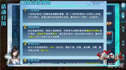 门派竞技,热血盛世。同门云集、切磋武艺、收获奖励。愿少侠可以披荆斩棘,一路过关斩将,凭借自身实力,勇夺新人王的桂冠。