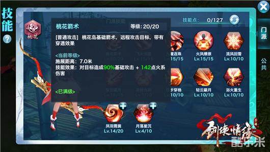 1、桃花箭术。【普通攻击】桃花岛基础箭术。远程攻击目标,带有穿透效果。20级时对目标造成90%的基础攻击+142点火系伤害。90级辅助技能月落星沉可以使桃花箭术命中敌方后额外造成伤害,且该伤害无视无敌状态。百步穿杨和月落星沉的叠加切实加强了桃花箭术的杀伤输出,对战天王等门派时掌握了更多的主动性。