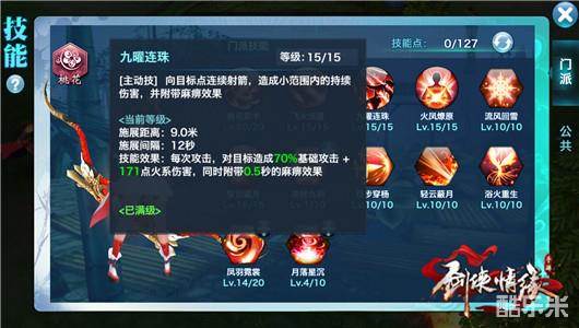 3、九曜连珠。【主动技】向目标点连续射箭,造成小范围内的持续伤害,并附带麻痹效果。15级时,施展间隔12秒,对目标造成70%的基础攻击+171点火系伤害,并附带0.5秒的麻痹效果。九曜连珠的威力需借助桃花秘籍来发挥,特别是高级秘籍九耀连珠可以大幅提高会心伤害和攻击力,是桃花收割残血目标的可靠手段。