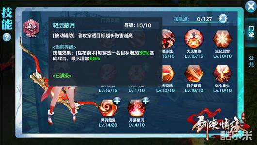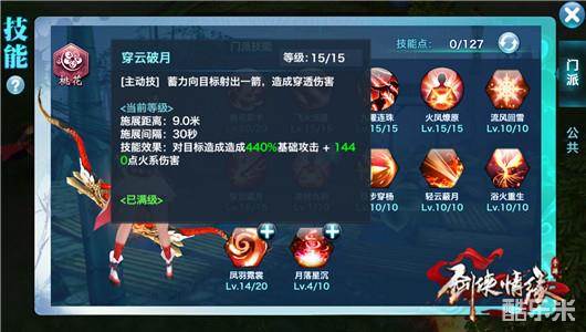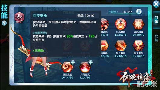 3、百步穿杨。【被动辅助】提升桃花箭术的威力,并增加第四式的弓箭数量。10级时,提升桃花箭术30%的基础攻击+120点火系伤害。