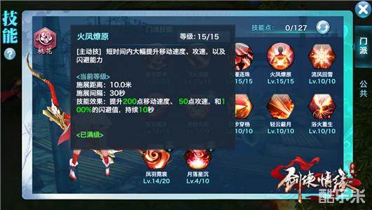 5、火凤燎原。【主动技】短时间内大幅提升移动速度、攻速、以及闪避能力。15级时施展间隔30秒,提升200点移动速度、50点攻速和100%的闪避值,持续10秒。火凤燎原是桃花门派的镇派绝学,这种增益状态的呈现强化了桃花在战场的生存能力和攻击速度,短时间内巩固了输出的基础。如果没有火凤燎原做支撑,则桃花的脆弱会严重拉断其攻击的长处,几乎无所作为。火凤燎原的持续时间可以通过桃花秘籍来延长,这样的设置使桃花在95级后群战的优势将变得更加明显。