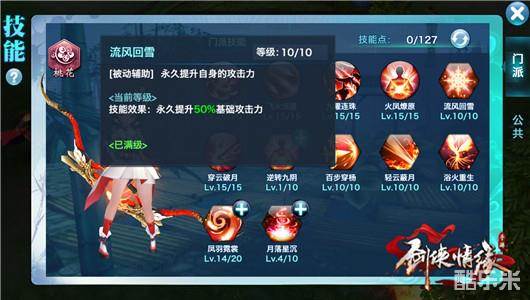 1、流风回雪。【被动辅助】永久提升自身攻击力。10级时,永久提升50%的基础攻击力。