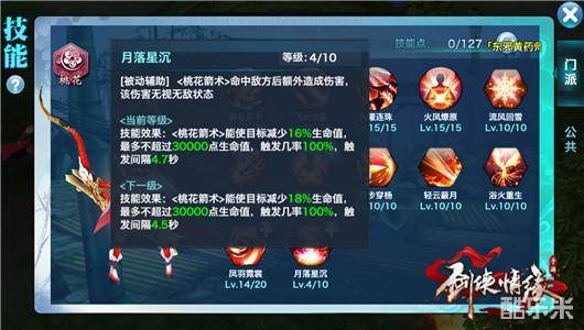 7、月落星沉。【被动辅助】桃花箭术命中敌方后额外造成伤害,该伤害无视无敌状态。5级时,桃花箭术能使目标减少18%生命值,最多不超过30000点生命值,触发几率100%,触发间隔4.5秒。月落星沉属90技能,其对无敌状态无视的特点,甚至承担着技能平衡及门派平衡的重任,缓解了对战金系门派的尴尬,一定程度上也促进了攻击效果。是一个非常值得(满级)期待的技能。