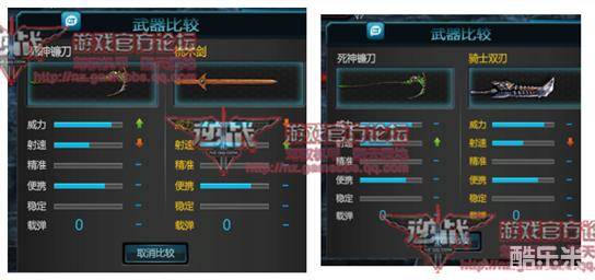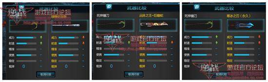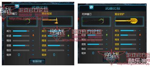 在这里我们可以看到死神镰刀的威力要比桃木剑要高,而且射速要比骑士双刃要快,也就是手速来说死神镰刀要比上面两样都要快。而且在跟黄金系列武器的比较图(见下图)可以得知,