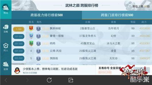 在跨服门派排行前500中,我们可以看到所有和你所在区服开放了相同等级上限的区服内与你相同门派少侠战力排行前500名。如果你榜上有名就可以领取对应门派的称号“门派豪杰”。
